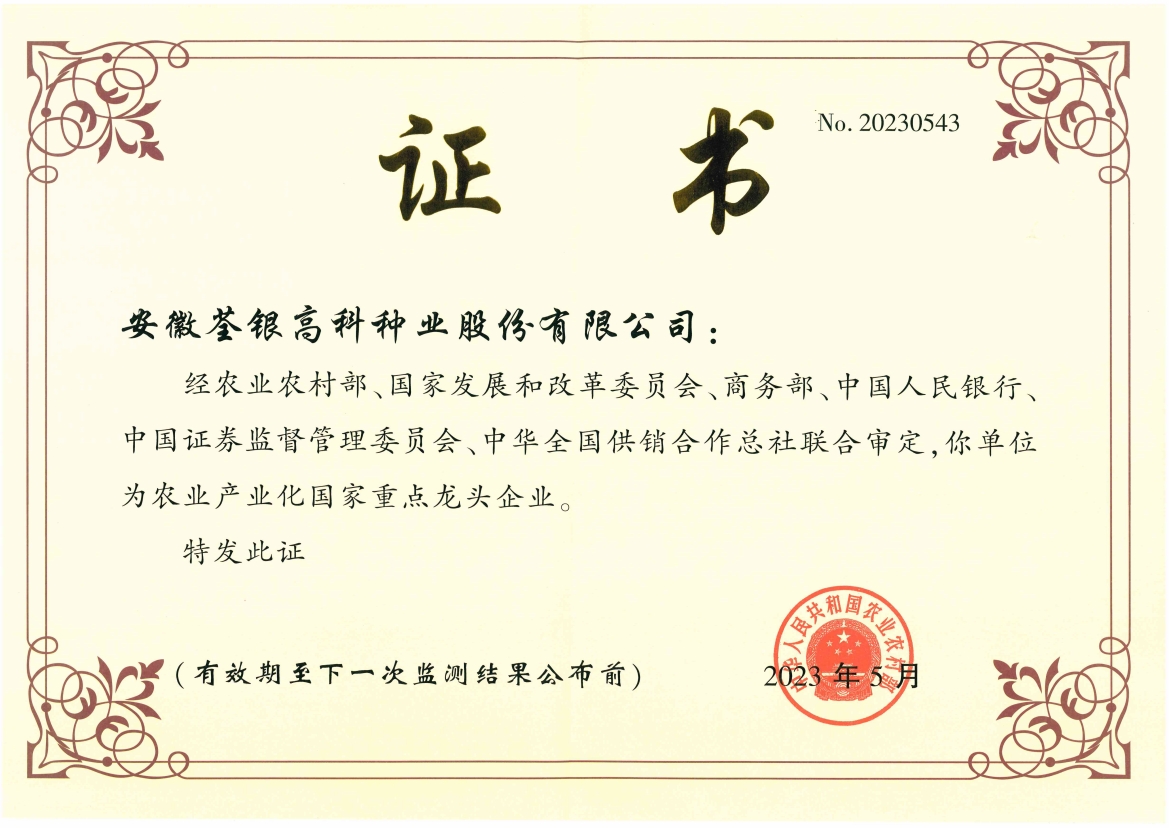 安徽荃銀高科種業(yè)股份有限公司是一家“以種業(yè)為核心、農(nóng)業(yè)服務(wù)為延伸、探索和創(chuàng)新農(nóng)業(yè)多元化發(fā)展”的現(xiàn)代高科技種業(yè)上市公司,證券代碼:300087。公司注冊資金9.47億元,系“中國種業(yè)領(lǐng)軍企業(yè)、農(nóng)業(yè)產(chǎn)業(yè)化國家重點(diǎn)龍頭企業(yè)、國家高新技術(shù)企業(yè)、農(nóng)業(yè)部首批農(nóng)作物種子育繁推一體化企業(yè)、中國種業(yè)信用明星企業(yè)"。在國內(nèi)控股子公司20多家,在國外設(shè)立分支機(jī)構(gòu)4家,良種銷售至全國20多個(gè)省(市、區(qū)),出口覆蓋20多個(gè)國家與地區(qū),種業(yè)綜合實(shí)力、雜交水稻研發(fā)、推廣及海外業(yè)務(wù)規(guī)模均居全國種子企業(yè)前2位。
